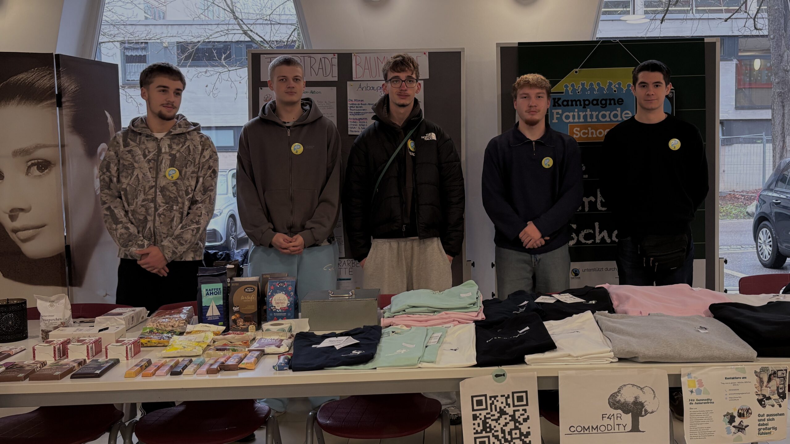Am Freitag, den 5. Dezember 2025, fand wieder einmal ein Verkauf unserer Juniorenfirma F41r Commodity im Kommunikationszentrum der GvSS statt. Schülerinnen und Schüler sowie die Lehrkräfte der hatten ab der großen Pause die Möglichkeit, T-Shirts und Hoodies aus unserem vielfältigen Fairtrade-Sortiment zu erwerben. Zusätzlich zu den Kleidungsstücken wurden auch verschiedene Snacks aus dem Eine-Weltladen angeboten, die nachhaltig produziert und fair gehandelt werden und somit das Sortiment sinnvoll ergänzten. Außerdem konnten sich die Besucherinnen und Besucher über unsere Juniorenfirma informieren und mehr über unsere Arbeit erfahren.